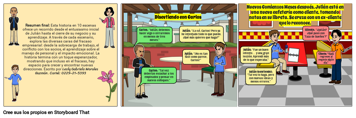 Resumen final: Esta historia en 10 escenas ofrece un recorrido desde el entusiasmo inicial de Julián hasta el cierre de su negocio y su aprendizaje. A través de cada escenario, explora las diversas caras del fracaso empresarial: desde la sobrecarga de trabajo, el conflicto con los socios, el aprendizaje sobre el manejo de personal y el impacto emocional. La historia termina con un toque esperanzador, mostrando que incluso en el fracaso, hay espacio para crecer y encontrar nuevas direcciones. Escrito por Lesly Gabriela Morales Guzmán. Carné: 0229-21-5393