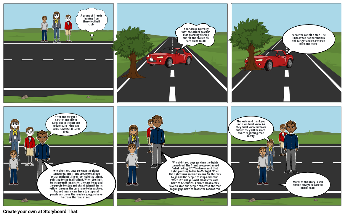 Why didnt you guys go when the lights turned red. The friend group exclaimed "what red light!". The driver said that light, pointing to the traffic light. When the light turns green it means for the cars to go and the people to stop and stand. When it turns yellow it means the cars have to be cautios. And red means cars have to stop and people can cross the road so you guys have to cross the road at red.