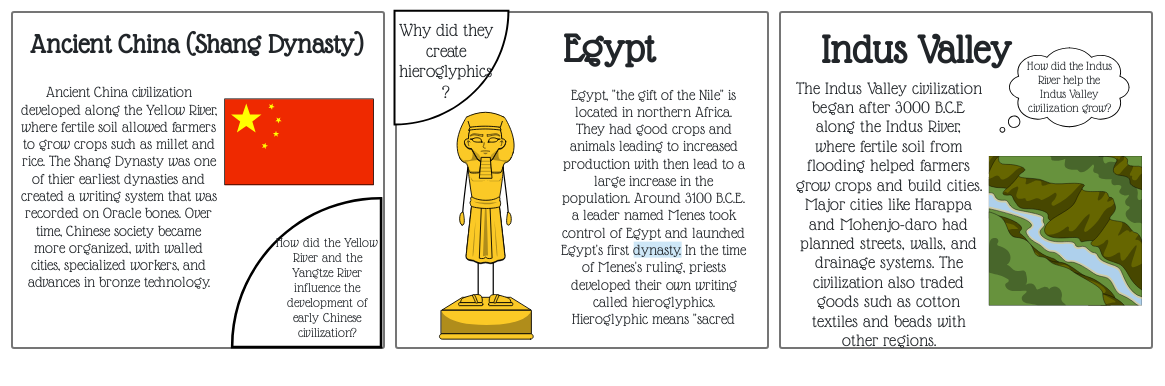 Ancient China civilization developed along the Yellow River, where fertile soil allowed farmers to grow crops such as millet and rice. The Shang Dynasty was one of thier earliest dynasties and created a writing system that was recorded on Oracle bones. Over time, Chinese society became more organized, with walled cities, specialized workers, and advances in bronze technology.