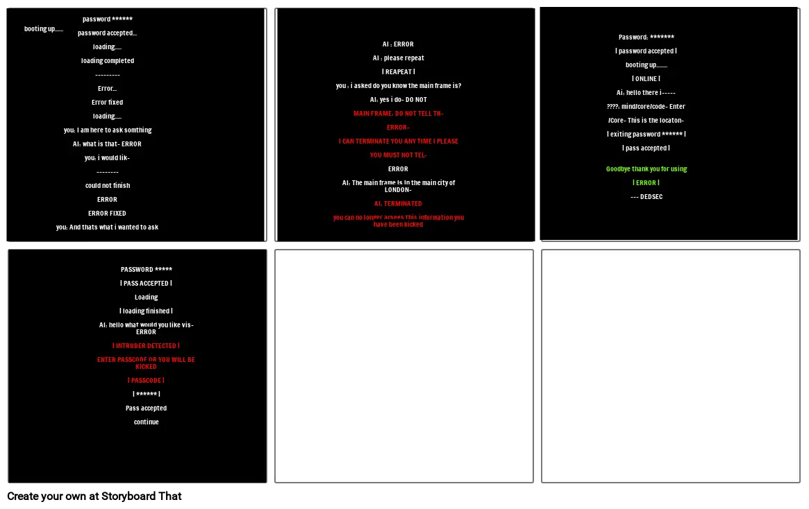 Password: *******| password accepted |booting up........| ONLINE |Ai: hello there i-----????: mind/core/code- Enter/Core- This is the locaton-| exiting password ****** || pass accepted |Goodbye thank you for using| ERROR |--- DEDSEC