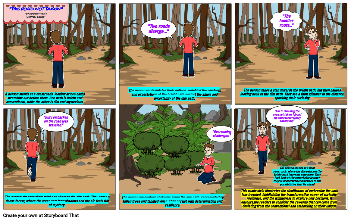 This comic strip illustrates the significance of embracing the path less traveled, highlighting the transformative power of curiosity, resilience, and the willingness to explore new horizons. It encourages readers to consider the rewards that can come from deviating from the conventional and embarking on their unique journey.