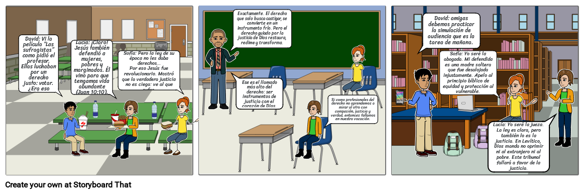 Sofía: Yo seré la abogada. Mi defendida es una madre soltera que fue desalojada injustamente. Apelo al principio bíblico de equidad y protección al vulnerable.