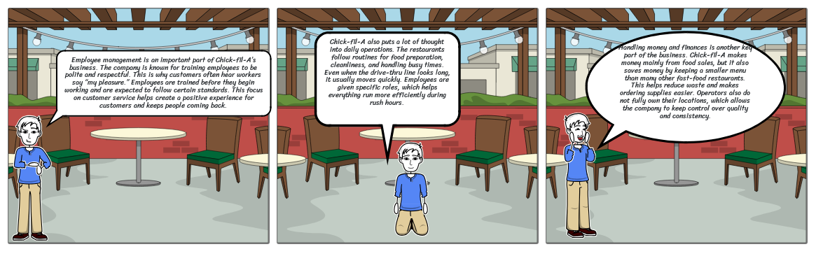 Handling money and finances is another key part of the business. Chick-fil-A makes money mainly from food sales, but it also saves money by keeping a smaller menu than many other fast-food restaurants. This helps reduce waste and makes ordering supplies easier. Operators also do not fully own their locations, which allows the company to keep control over quality and consistency.