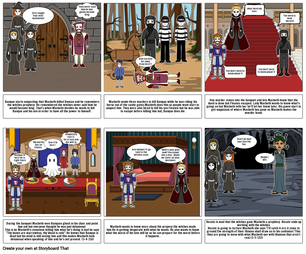 Macbeth sends three murders to kill Banquo while he was riding his horse out of the castle gates.Macbeth does this so people wont start to suspect him. They were also hired to kill his son Fleance but he was able to escape before killing him but, Banquo does die.