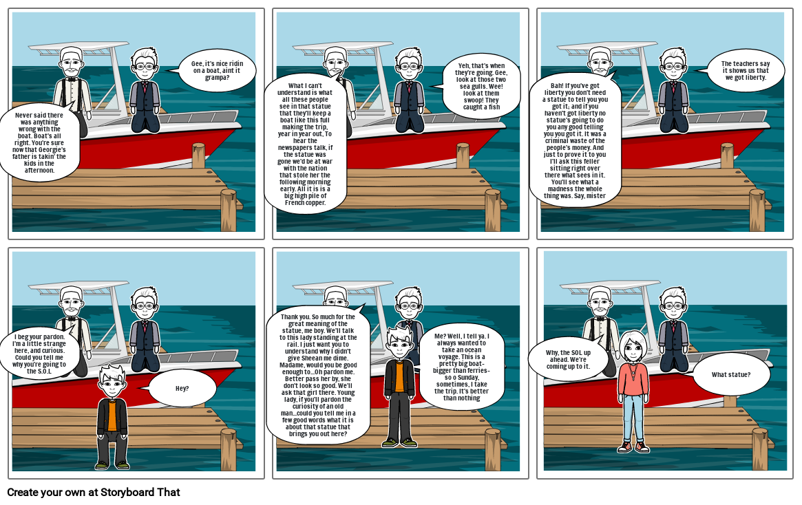 Thank you. So much for the great meaning of the statue, me boy. We'll talk to this lady standing at the rail. I just want you to understand why I didn't give Sheean me dime. Madame, would you be good enough to...Oh pardon me. Better pass her by, she don't look so good. We'll ask that girl there. Young lady, if you'll pardon the curiosity of an old man...could you tell me in a few good words what it is about that statue that brings you out here?