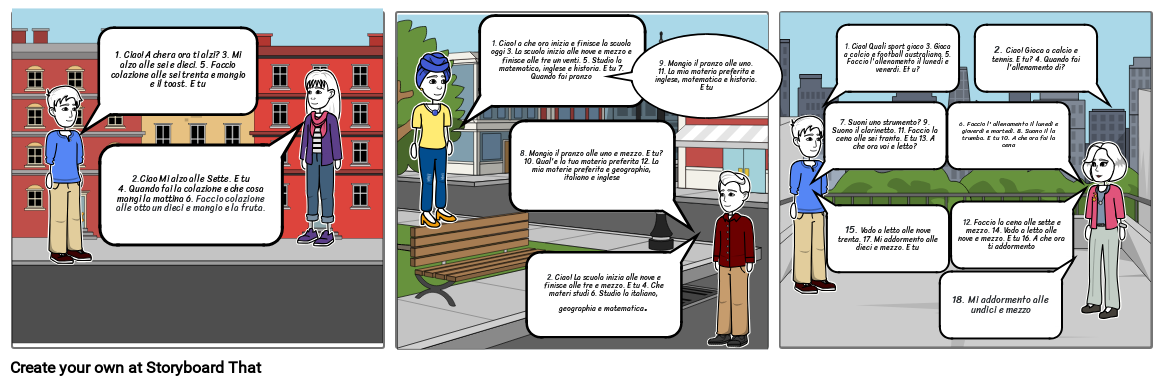 8. Mangio il pranzo alle uno e mezzo. E tu? 10. Qual'e la tua materia preferita 12. La mia materie preferita e geographia, italiano e inglese