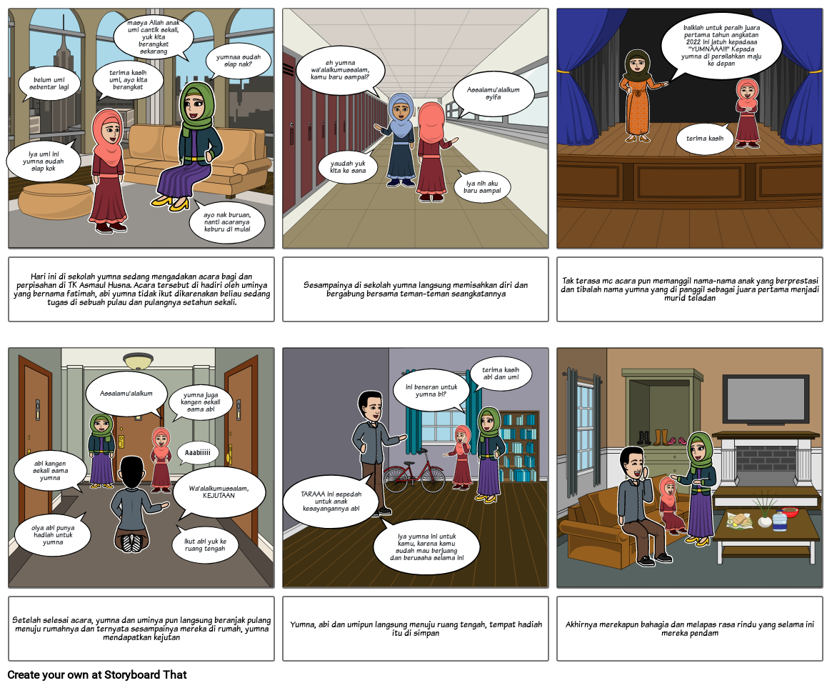 Hari ini di sekolah yumna sedang mengadakan acara bagi dan perpisahan di TK Asmaul Husna. Acara tersebut di hadiri oleh uminya yang bernama fatimah, abi yumna tidak ikut dikarenakan beliau sedang tugas di sebuah pulau dan pulangnya setahun sekali.