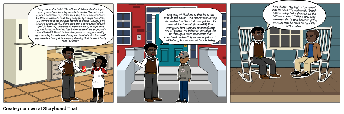 Troy cannot deal with life without drinking. So don’t you worry about me drinking myself to death, ’Cause I ain’t worried about Death, I done seen him, I done wrestled with himRose is worried about Troy drinking too much, “So don’t you worry about me drinking myself to death, ’Cause I ain’t worried about Death, I done seen him, I done wrestled with him” (Wilson 16). Troy uses drinking as a way to cope with fear and loss, and to feel like he’s in control. By saying he’s wrestled with Death he tries to appear strong, but really he’s masking his pain and struggles. Alcohol helps him avoid the emotional weight he carries, showing that he can’t truly face life sober.