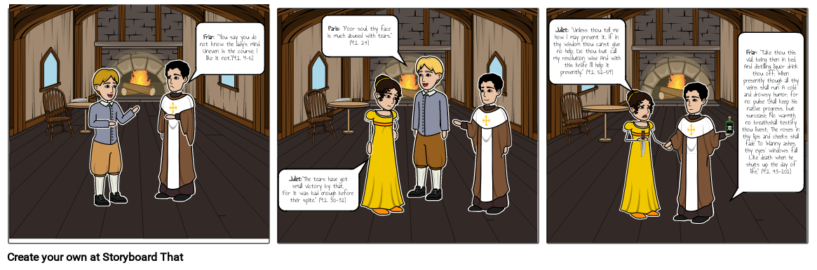 Objective Summary: Paris goes to the Friar's cell to tell him about Juliet and himself marrying each other on Thursday. The Friar does not like the idea of marrying Juliet to Paris because he has already married Juliet to Romeo and feels like the wedding date is too soon. Then Juliet arrives at the Friar's cell and smartly avoids Paris’s comments about marrying her and her being his wife. After Paris leaves Juliet to talk to the Friar by themselves, Juliet tells the Friar that she does not want to marry Paris because she loves Romeo but she fears that death is her only option if he can not help her stop the wedding. The Friar then tells Juliet about a solution to her problem which is a sleeping potion that will make it appear that she is dead but will be unconscious and put in her family’s tomb since her family does know about the Friar’s and her plan. While Juliet is asleep the Friar will tell Romeo about the plan so Juliet and Romeo can be together. Juliet immediately agrees to the plan and will drink the potion Wednesday night which is the day before her wedding day to Paris.
