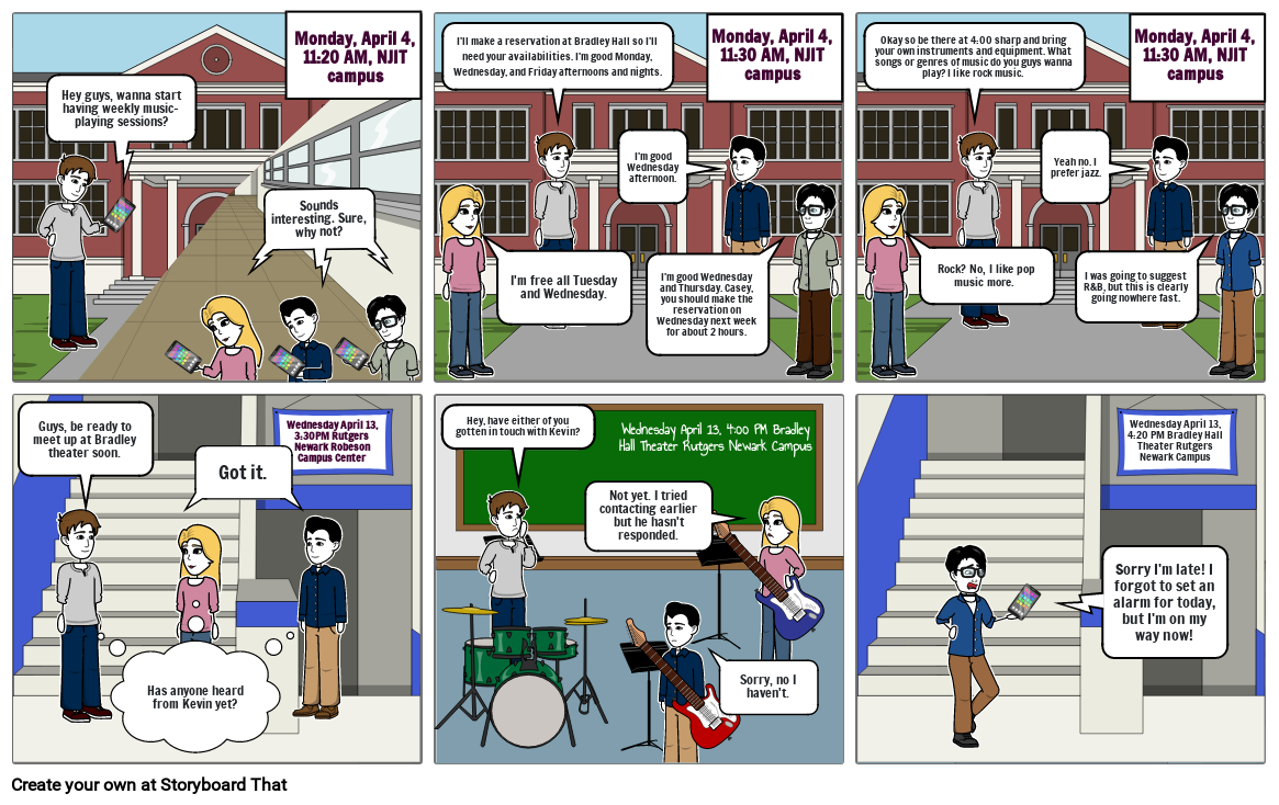 Okay so be there at 4:00 sharp and bring your own instruments and equipment. What songs or genres of music do you guys wanna play? I like rock music.