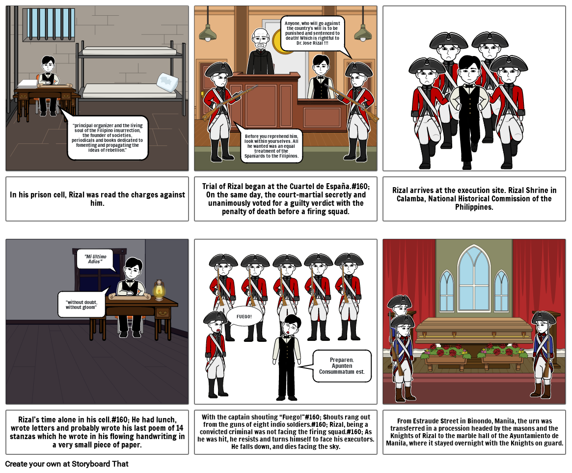 With the captain shouting “Fuego!”#160; Shouts rang out from the guns of eight indio soldiers.#160; Rizal, being a convicted criminal was not facing the firing squad.#160; As he was hit, he resists and turns himself to face his executors. He falls down, and dies facing the sky.