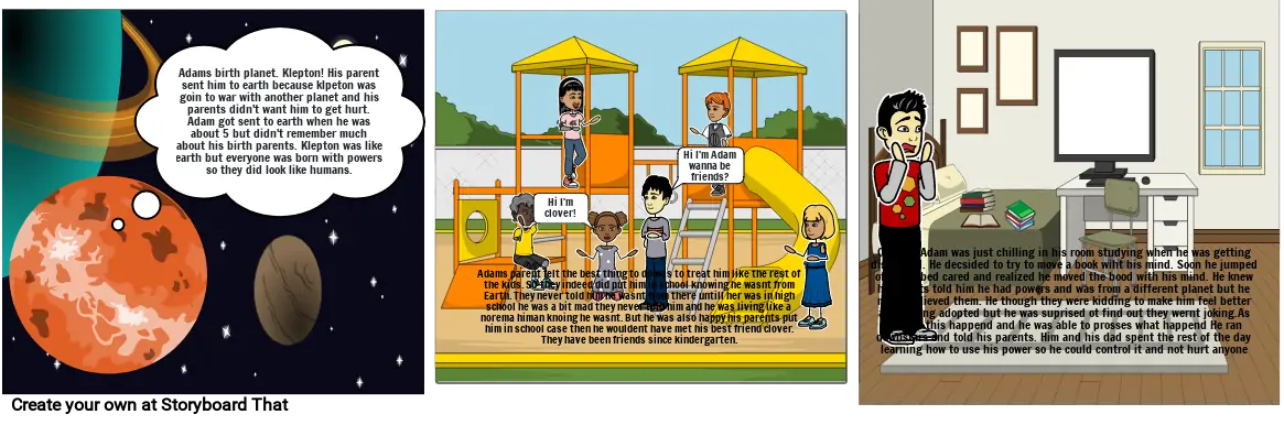 One day Adam was just chilling in his room studying when he was getting distracted. He decsided to try to move a book wiht his mind. Soon he jumped of of his bed cared and realized he moved the bood with his mind. He knew his parnts told him he had powers and was from a different planet but he never believed them. He though they were kidding to make him feel better about beng adopted but he was suprised ot find out they wernt joking.As soon as this happend and he was able to prosses what happend He ran downstars and told his parents. Him and his dad spent the rest of the day learning how to use his power so he could control it and not hurt anyone