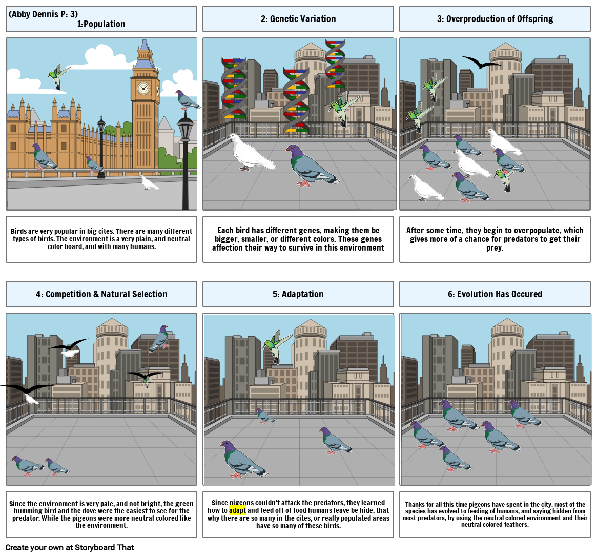 Each bird has different genes, making them be bigger, smaller, or different colors. These genes affection their way to survive in this environment