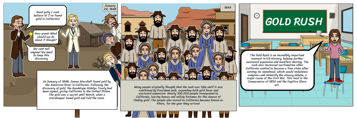 The Gold Rush is an incredibly important moment in US History, helping further westward expansion and manifest destiny. The rush also increased sectionalism after California wanted to become a free state after earning its statehood, which would imbalance congress and intensify the slavery debate, a major cause of the Civil War. This lead to the Compromise of 1850 and the Fugitive Slave act.
