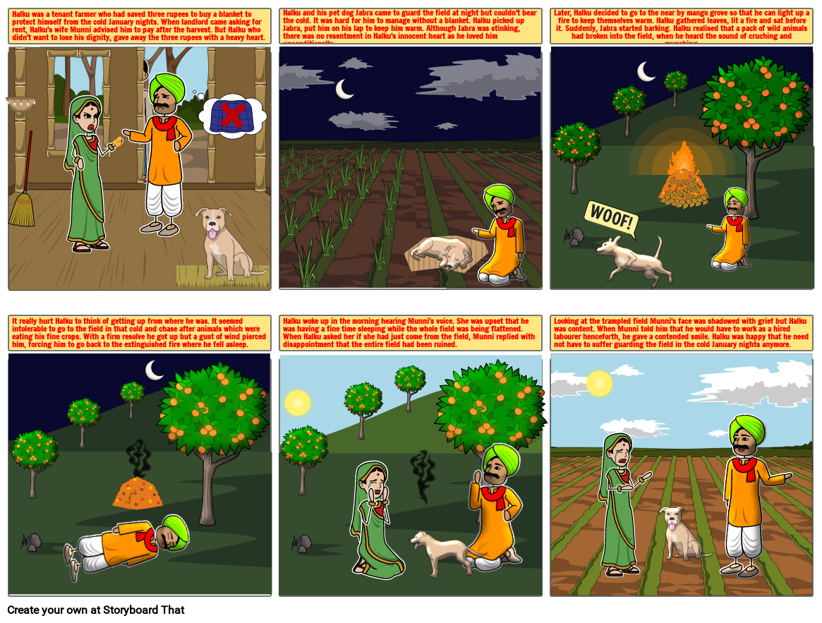 Halku and his pet dog Jabra came to guard the field at night but couldn't bear the cold. It was hard for him to manage without a blanket. Halku picked up Jabra, put him on his lap to keep him warm. Although Jabra was stinking, there was no resentment in Halku's innocent heart as he loved him unconditionally.