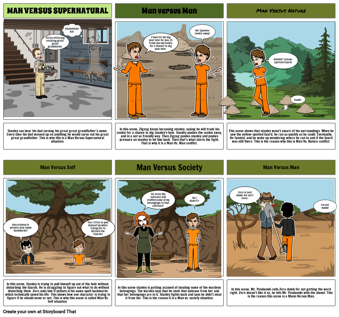 In this scene, Stanley is trying to pull himself up out of the hole without disturbing the lizards. He is struggling to figure out what to do without disturbing them. Zero asks him if yelnats is his name spelt backwards which technically saved his life. This shows how one character is trying to figure if he should move or not. This is why this scene is called Man Vs. Self situation.