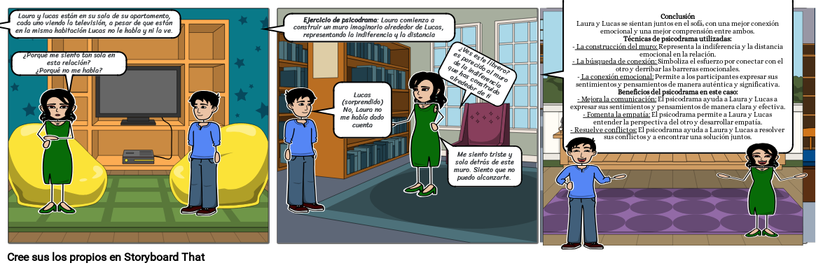 ConclusiónLaura y Lucas se sientan juntos en el sofá, con una mejor conexión emocional y una mejor comprensión entre ambos. Técnicas de psicodrama utilizadas:- La construcción del muro: Representa la indiferencia y la distancia emocional en la relación.- La búsqueda de conexión: Simboliza el esfuerzo por conectar con el otro y derribar las barreras emocionales.- La conexión emocional: Permite a los participantes expresar sus sentimientos y pensamientos de manera auténtica y significativa.Beneficios del psicodrama en este caso:- Mejora la comunicación: El psicodrama ayuda a Laura y Lucas a expresar sus sentimientos y pensamientos de manera clara y efectiva.- Fomenta la empatía: El psicodrama permite a Laura y Lucas entender la perspectiva del otro y desarrollar empatía.- Resuelve conflictos: El psicodrama ayuda a Laura y Lucas a resolver sus conflictos y a encontrar una solución juntos.