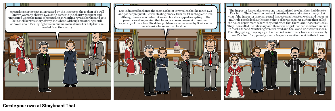The Inspector leaves after everyone had admitted to what they had done to Eva Smith. Then Gerald comes back into the house and states a theory that what if the Inspector is not an actual Inspector; as he acted weird and never let multiple people look at the same photo of her at once. Mr Burling then called the police department where they confirmed that there is no 'Inspector Goole'. They then called the infirmary and there was no girl that had died from suicide in moths. Mr and Mrs Birling were relieved and Sheila and Eric were in shock. Then they got a girl saying a girl has died in the infirmary from suicide, exactly how 'Eva Smith' supposedly died. a Inspector was then sent to their house.