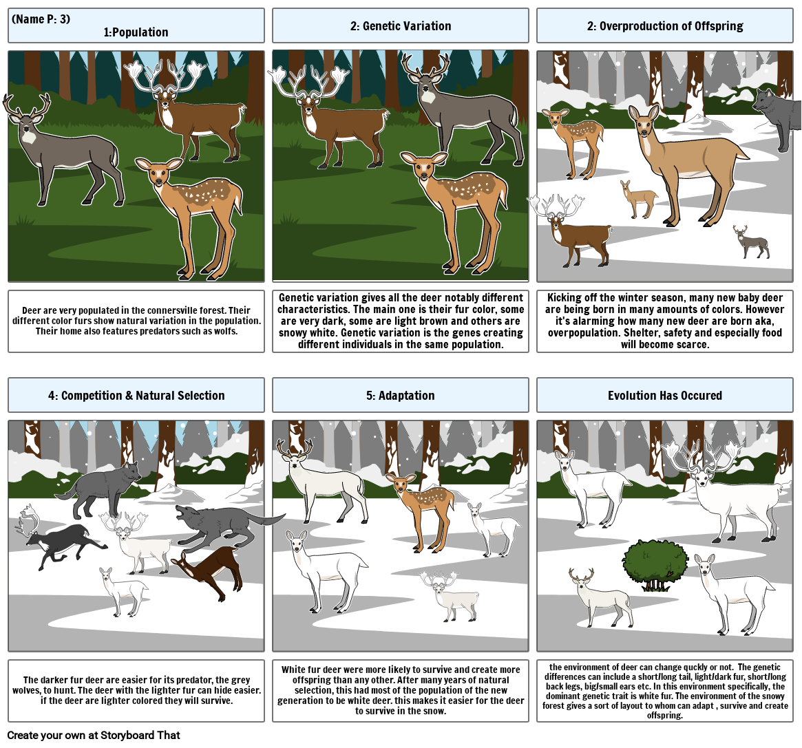 the environment of deer can change quckly or not. The genetic differences can include a short/long tail, light/dark fur, short/long back legs, big/small ears etc. In this environment specifically, the dominant genetic trait is white fur. The environment of the snowy forest gives a sort of layout to whom can adapt , survive and create offspring.