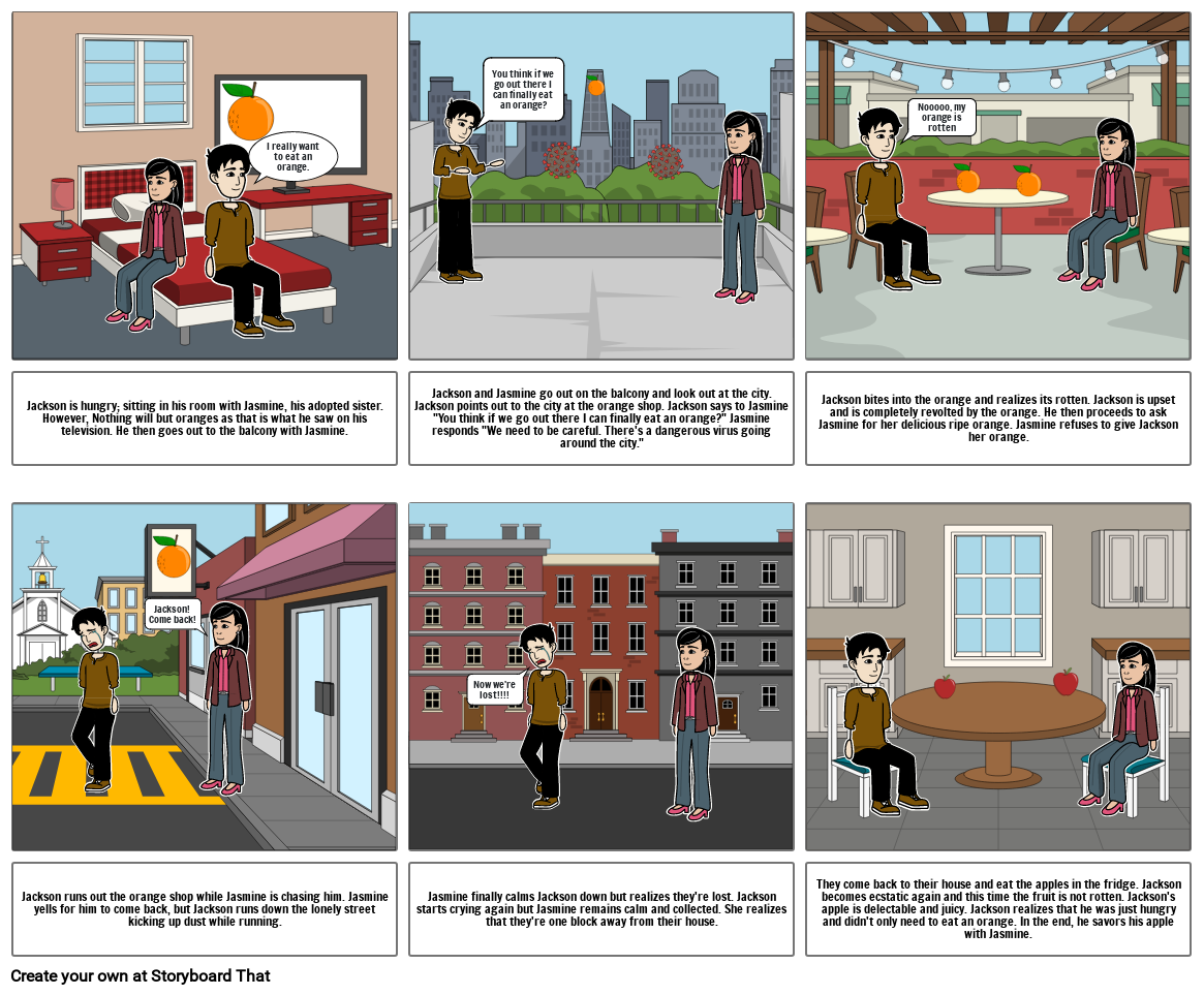 Jackson is hungry; sitting in his room with Jasmine, his adopted sister. However, Nothing will but oranges as that is what he saw on his television. He then goes out to the balcony with Jasmine.