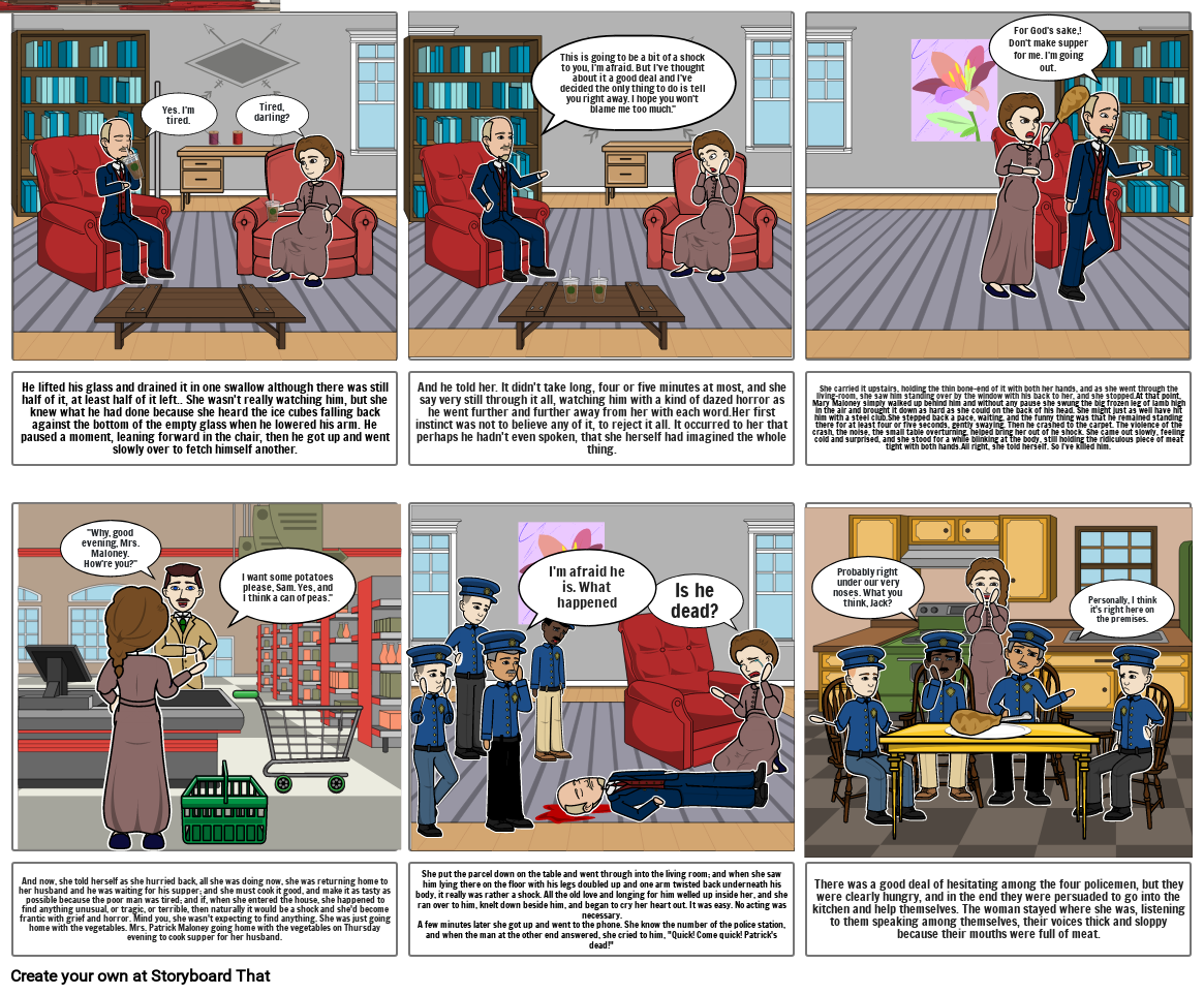 She carried it upstairs, holding the thin bone-end of it with both her hands, and as she went through the living-room, she saw him standing over by the window with his back to her, and she stopped.At that point, Mary Maloney simply walked up behind him and without any pause she swung the big frozen leg of lamb high in the air and brought it down as hard as she could on the back of his head. She might just as well have hit him with a steel club.She stepped back a pace, waiting, and the funny thing was that he remained standing there for at least four or five seconds, gently swaying. Then he crashed to the carpet. The violence of the crash, the noise, the small table overturning, helped bring her out of he shock. She came out slowly, feeling cold and surprised, and she stood for a while blinking at the body, still holding the ridiculous piece of meat tight with both hands.All right, she told herself. So I've killed him.