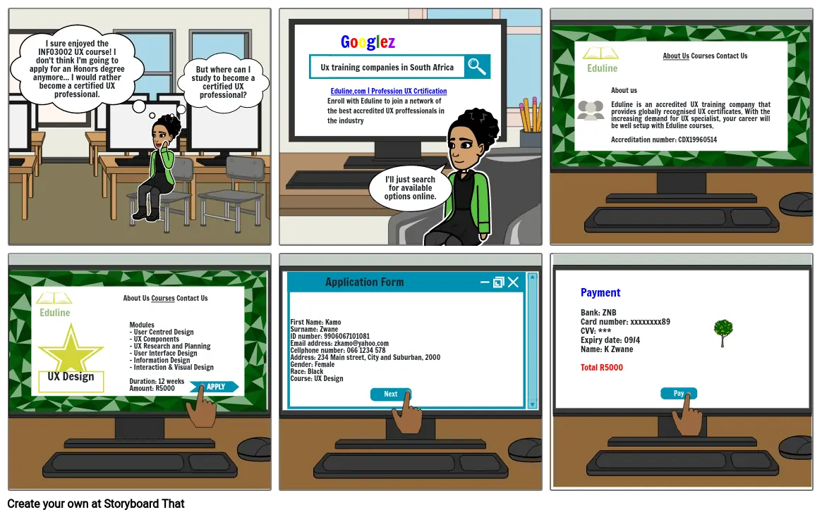 Application Form First Name: Kamo Surname: Zwane ID number: 9906067101081 Email address: zkamo@yahoo.com Cellphone number: 066 1234 578 Address: 234 Main street, City and Suburban, 2000 Gender: Female Race: Black Course: UX Design
