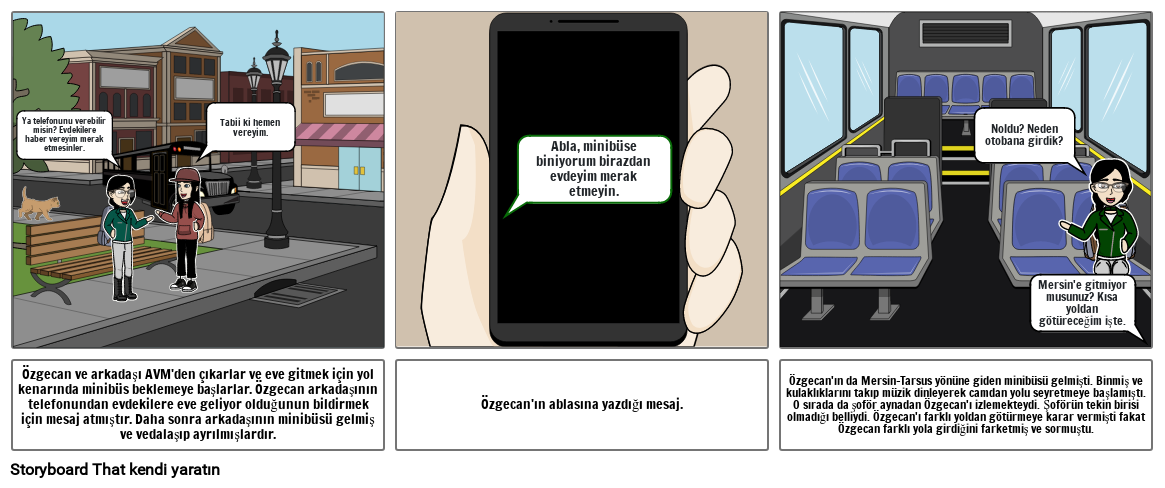 Özgecan'ın da Mersin-Tarsus yönüne giden minibüsü gelmişti. Binmiş ve kulaklıklarını takıp müzik dinleyerek camdan yolu seyretmeye başlamıştı. O sırada da şoför aynadan Özgecan'ı izlemekteydi. Şoförün tekin birisi olmadığı belliydi. Özgecan'ı farklı yoldan götürmeye karar vermişti fakat Özgecan farklı yola girdiğini farketmiş ve sormuştu.