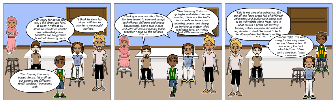 "Im sorry for acting the way I did about you food. It wasn't right at all since we should all accept and acknowledge how beautiful our playground is full of diversity and a multicultural year."