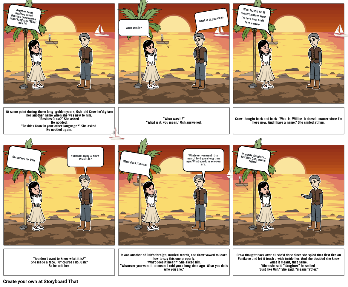 Crow thought back over all she'd done since she spied that first fire on Penikese and let it touch a wick inside her. And she decided she knew what it meant, that name.When she said "daughter" he smiled."Just like Osh," She said, "means father."