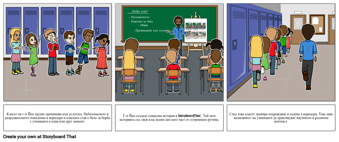 Г-н Йец създаде социална история в StoryboardThat . Той чете историята със своя клас всеки ден като част от сутрешната рутина.