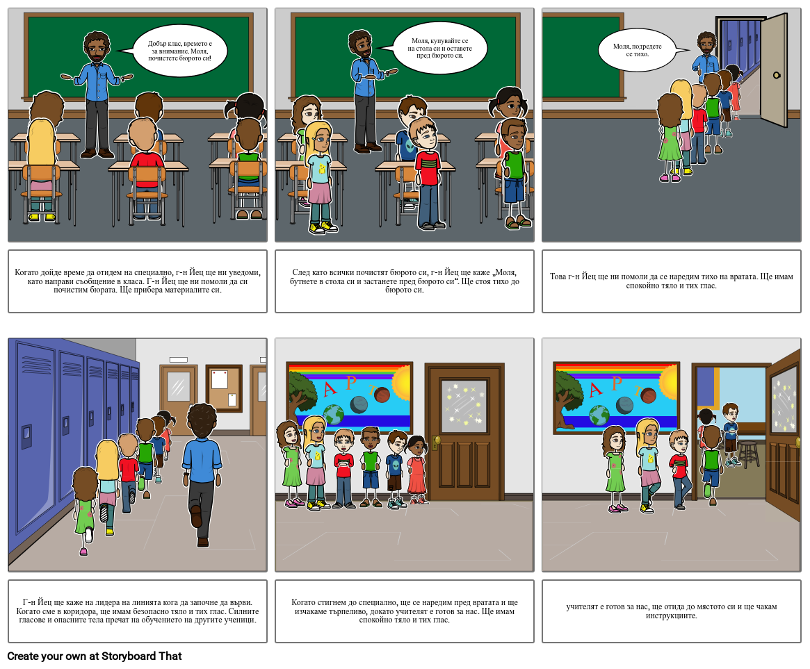 Г-н Йец ще каже на лидера на линията кога да започне да върви. Когато сме в коридора, ще имам безопасно тяло и тих глас. Силните гласове и опасните тела пречат на обучението на другите ученици.