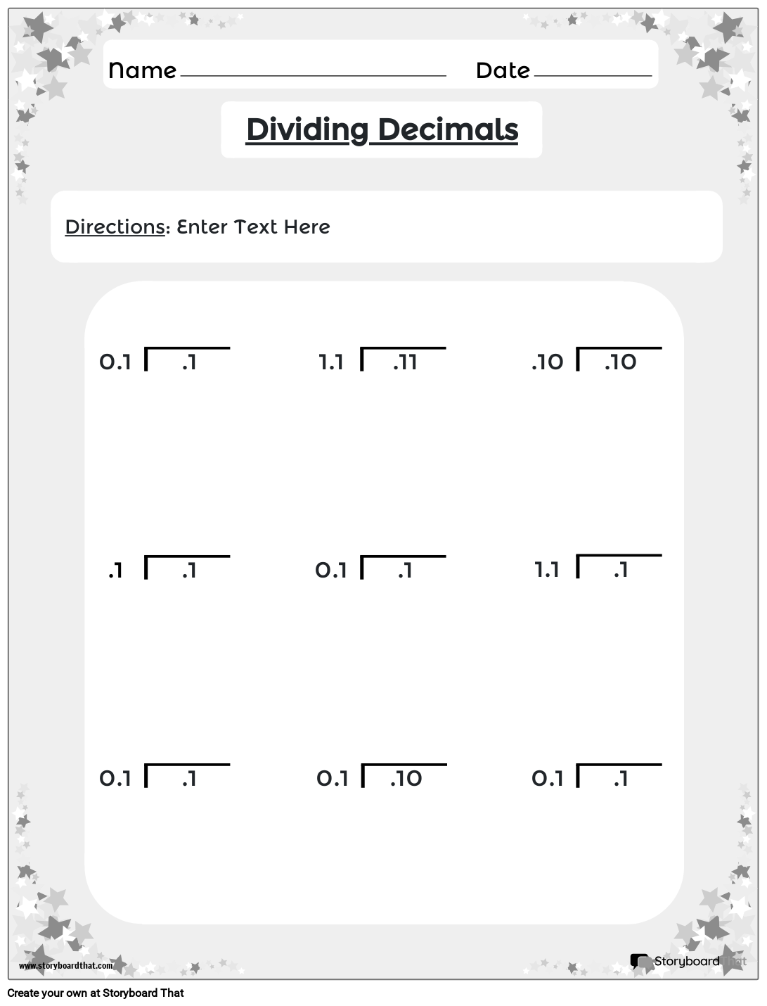 Портретен черно-бял работен лист за разделяне на десетични знаци. Звездна тематика.