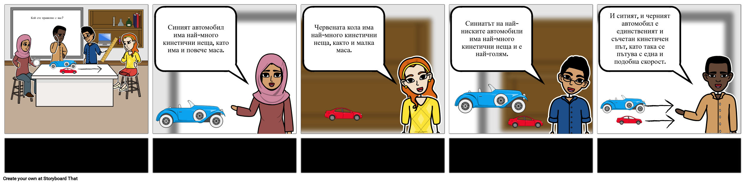 Учениците разглеждат кинетичната енергия на две колички. И двете коли се движат с еднаква скорост, но синята кола има по-голяма маса от червената.