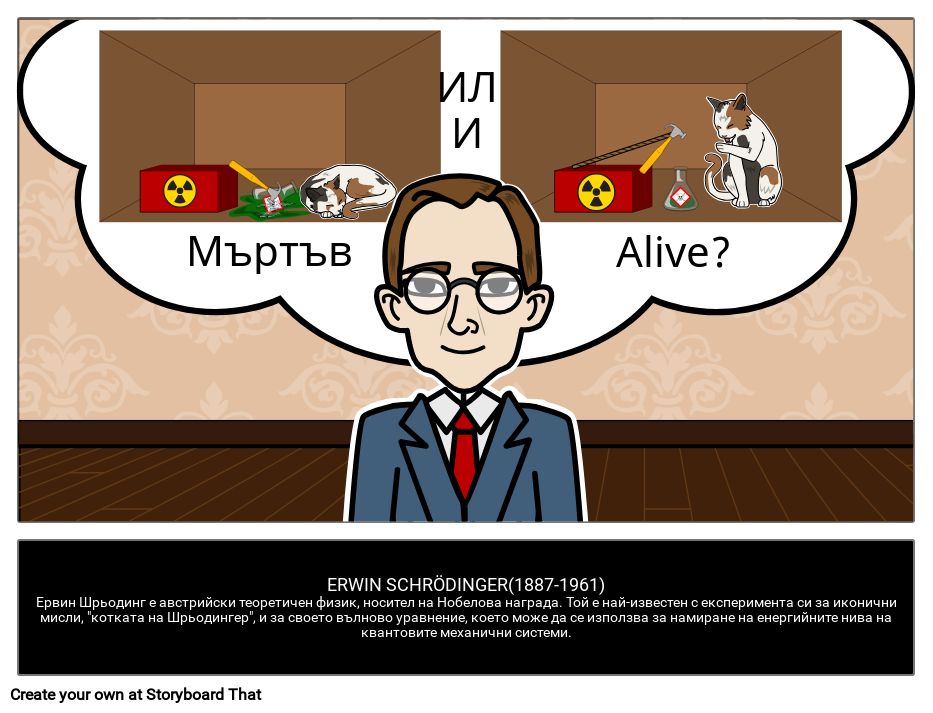 ERWIN SCHRÖDINGER(1887-1961)Ервин Шрьодинг е австрийски теоретичен физик, носител на Нобелова награда. Той е най-известен с експеримента си за иконични мисли, "котката на Шрьодингер", и за своето вълново уравнение, което може да се използва за намиране на енергийните нива на квантовите механични системи.
