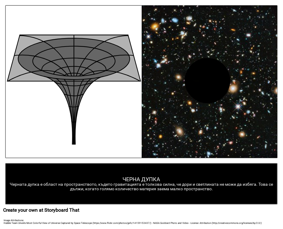 • ЧЕРНА ДУПКАЧерната дупка е област на пространството, където гравитацията е толкова силна, че дори и светлината не може да избяга. Това се дължи, когато голямо количество материя заема малко пространство.