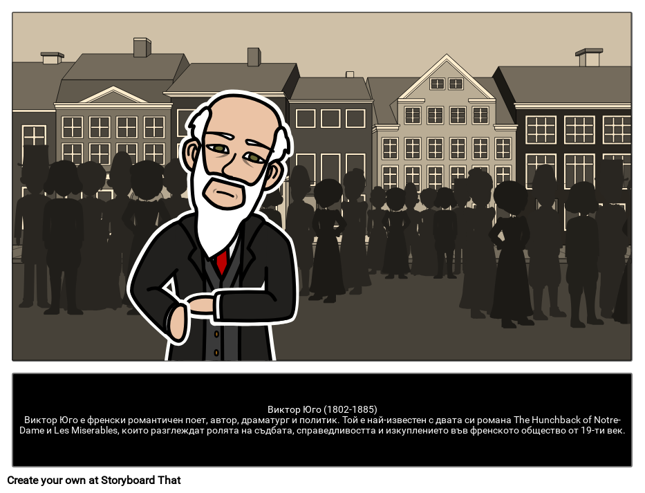 Виктор Юго (1802-1885)Виктор Юго е френски романтичен поет, автор, драматург и политик. Той е най-известен с двата си романа The Hunchback of Notre-Dame и Les Miserables, които разглеждат ролята на съдбата, справедливостта и изкуплението във френското общество от 19-ти век.
