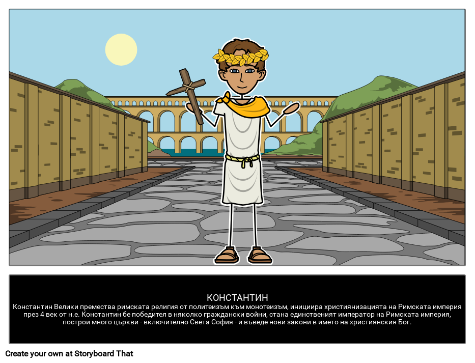 Константин Велики премества римската религия от политеизъм към монотеизъм, инициира християнизацията на Римската империя през 4 век от н.е. Константин бе победител в няколко граждански войни, стана единственият император на Римската империя, построи много църкви - включително Света София - и въведе нови закони в името на християнския Бог.
