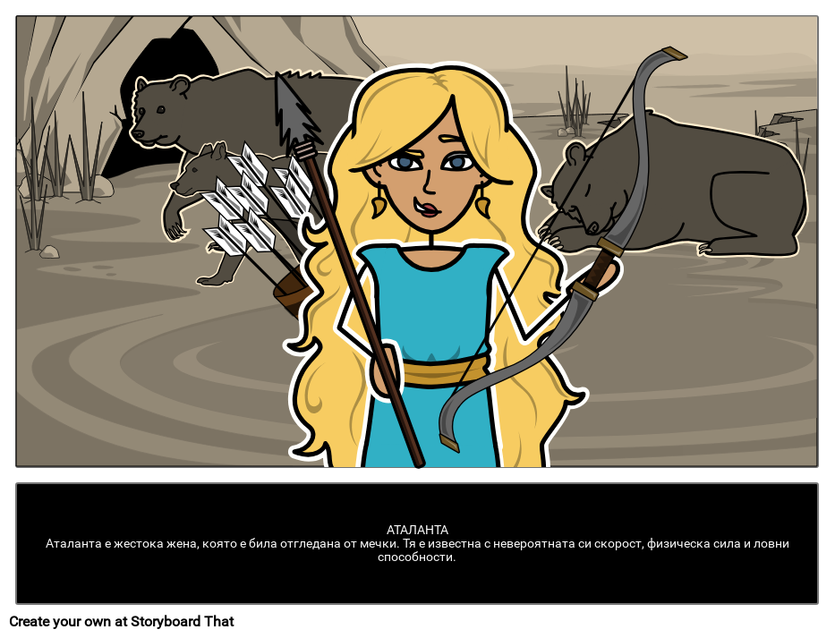 АТАЛАНТААталанта е жестока жена, която е била отгледана от мечки. Тя е известна с невероятната си скорост, физическа сила и ловни способности.