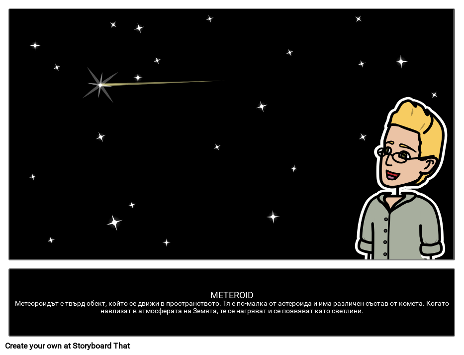 Метеороид | Метеороидът е твърд обект, който се движи в пространството. Тя е по-малка от астероида и има различен състав от комета. Когато навлизат в атмосферата на Земята, те се нагряват и се появяват като светещи светлини.