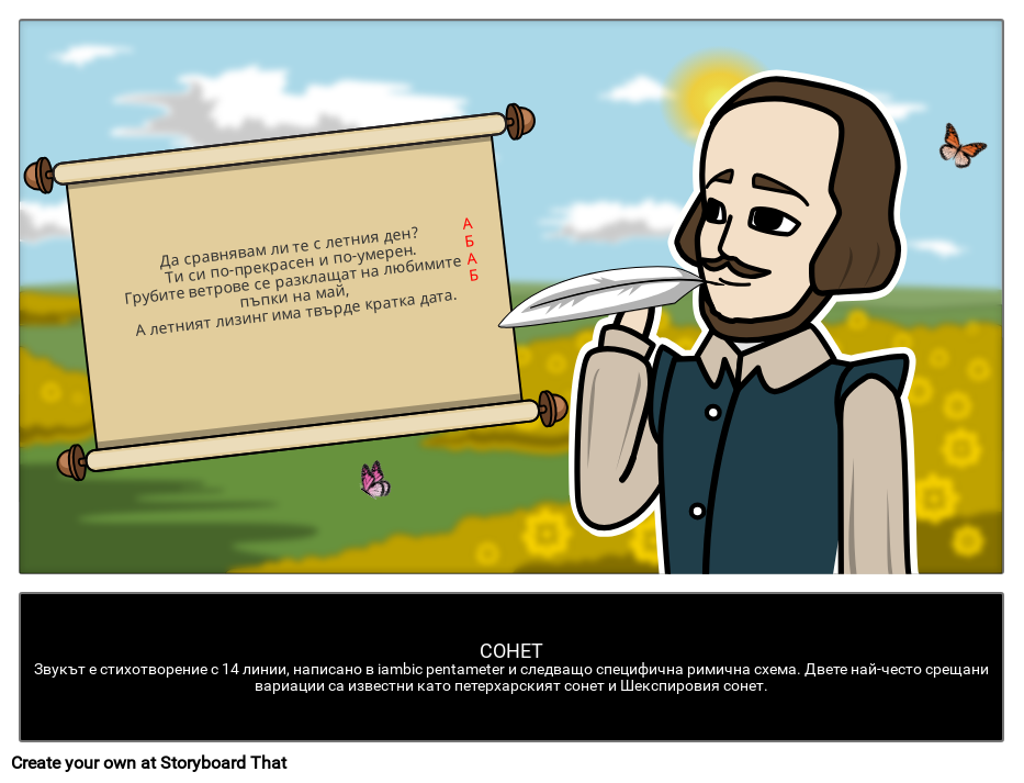 СОНЕТЗвукът е стихотворение с 14 линии, написано в iambic pentameter и следващо специфична римична схема. Двете най-често срещани вариации са известни като петерхарският сонет и Шекспировия сонет.