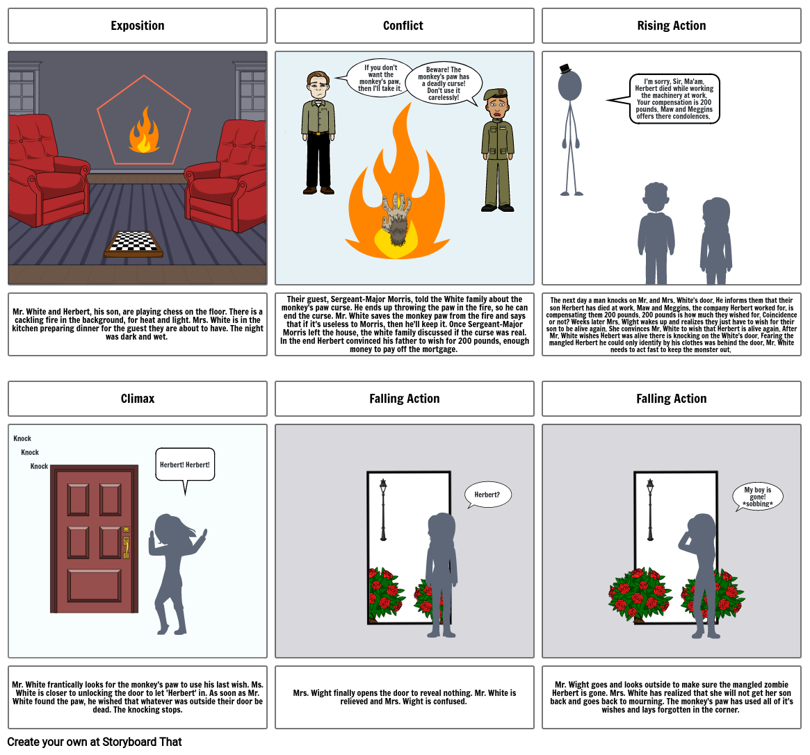 Mr. Wight goes and looks outside to make sure the mangled zombie Herbert is gone. Mrs. White has realized that she will not get her son back and goes back to mourning. The monkey's paw has used all of it's wishes and lays forgotten in the corner.