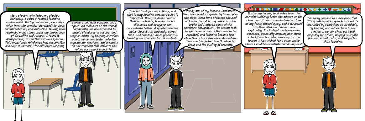 I understand your experience, and that is why keeping corridors quiet is important. When students control their noise levels, lessons are not disrupted and everyone can concentrate better. A quieter corridor helps classes run smoothly, saves time, and creates a more productive learning environment for all students.
