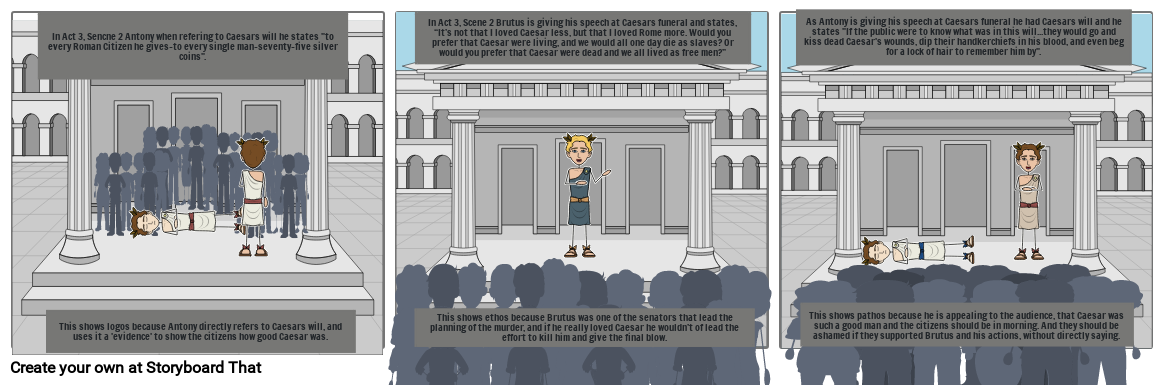 This shows ethos because Brutus was one of the senators that lead the planning of the murder, and if he really loved Caesar he wouldn’t of lead the effort to kill him and give the final blow.