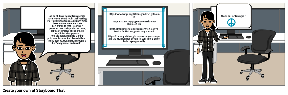 • https://www.change.org/t/transgender-rights-en-us https://act.hrc.org/page/95180/petition/1?locale=en-US https://freedomforallamericans.org/legislative-tracker/anti-transgender-legislation/ https://transequality.org/issues/resources/supporting-the-transgender-people-in-your-life-a-guide-to-being-a-good-ally