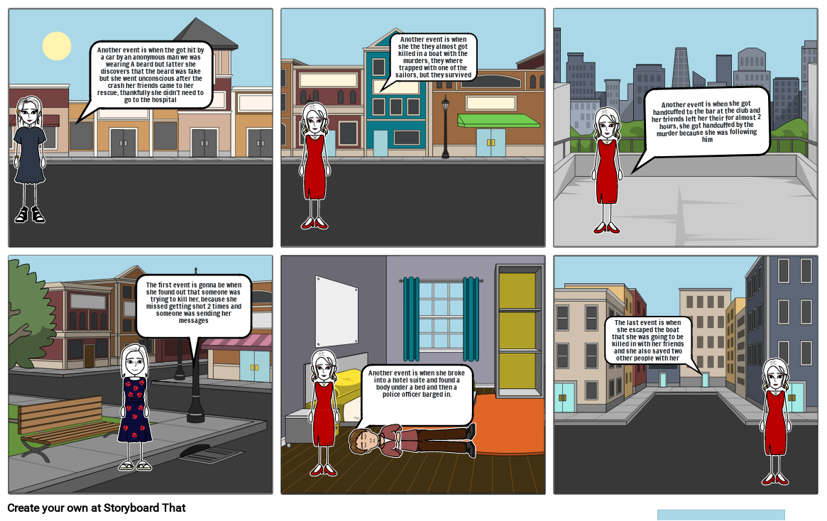 The first event is gonna be when she found out that someone was trying to kill her, because she missed getting shot 2 times and someone was sending her messages