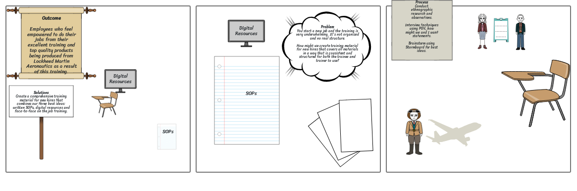 ProblemYou start a new job and the training is very underwhelming. It's not organized and no real structure.How might we create training material for new hires that covers all materials in a way that is consistent and structured for both the trainee and trainer to use?