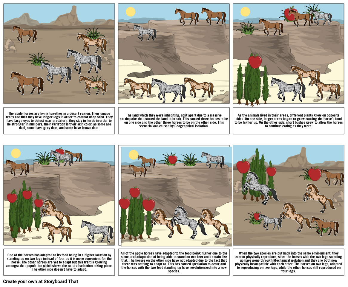 All of the apple horses have adapted to the food being higher due to the structural adaptation of being able to stand on two feet and remain like that. The horses on the other side have not adapted due to the fact that there was nothing to adapt to. This has caused speciation to occur and the horses with the two feet standing up have revolutionized into a new species.