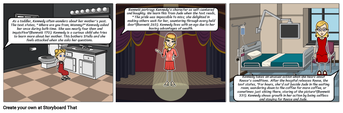 As a toddler, Kennedy often wonders about her mother's past. The text states, " Where are you from, Mommy?" Kennedy asked her once during bath time. She was nearly four then and inquisitive"(Bennett 170). Kennedy is a curious child who tries to learn more about her mother. This bothers Stella and she feels attacked when she asks her questions.