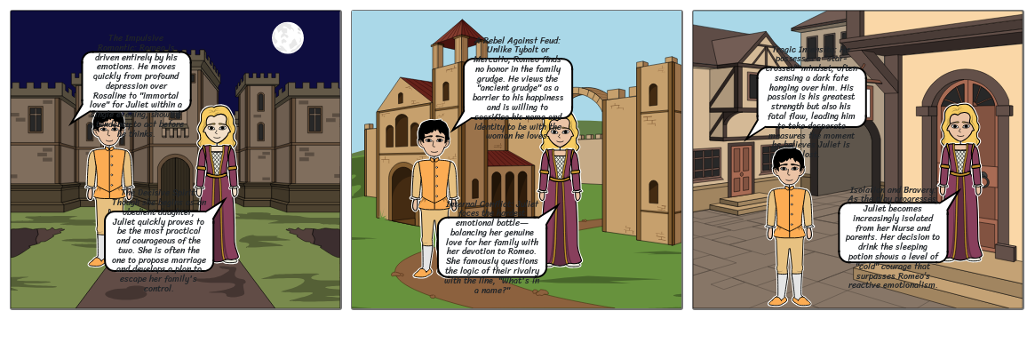 The Impulsive Romantic: Romeo is driven entirely by his emotions. He moves quickly from profound depression over Rosaline to "immortal love" for Juliet within a single evening, showing a tendency to act before he thinks.