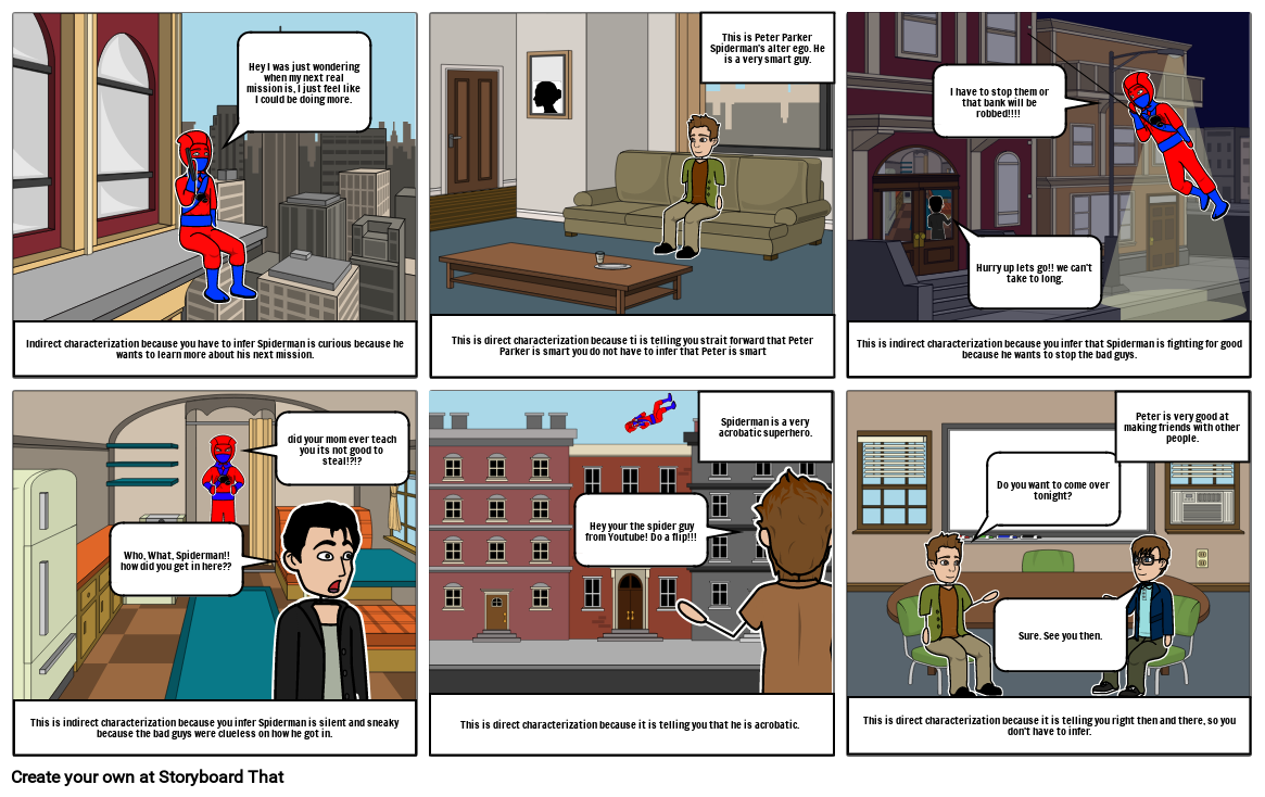 This is indirect characterization because you infer that Spiderman is fighting for good because he wants to stop the bad guys.